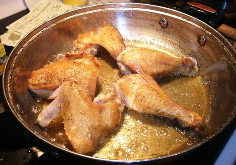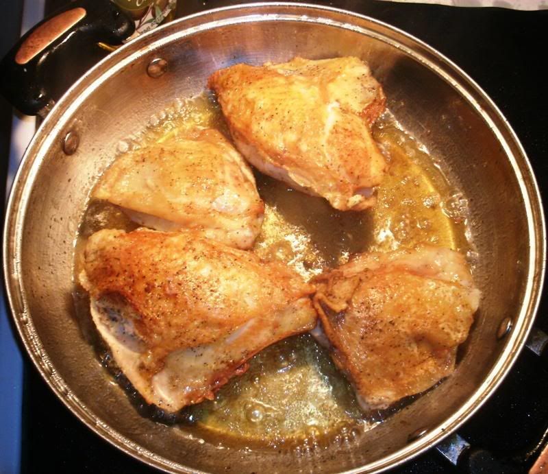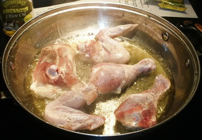 i salt-n-peppered the chicken and the heated up some olive oil in our wide, flat-bottomed skillet. then i proceeded to brown the chicken pieces