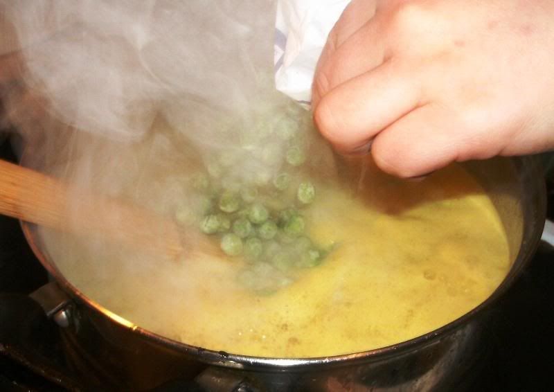 after bringing the water to a boil, my youngest son helped by adding the peas and chicken pieces: