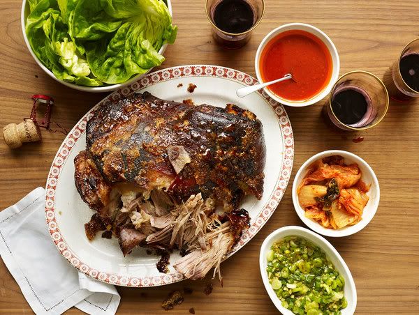 This weekend’s dinner is a slow-roasted shoulder of pig, a meal that can be picked apart by a table of friends armed only with chopsticks and lettuce. A tight and salty caramel crust sits on top of the moist, fragrant collapse of meat, and juices run thick to pool beneath it, a kind of syrup, delicious in its intensity. It is pork as pommes soufflé. The dish is known in Korea as bo ssam — pork wrapped like a package in fresh greens, with rice and kimchi. David Chang, the chef and an owner of a small restaurant empire in New York and abroad, offers an exemplary version at his Momofuku Ssam Bar in Manhattan’s East Village for $200, where it serves 6 to 10 people and regularly blows minds. That you can achieve almost exactly the same result at home for a fraction of the cost is both a testament to Chang’s magnanimity (he published a recipe for the dish in his recent “Momofuku” cookbook) and also an example of how important it is for chefs to be able to write good recipes. The best restaurant kitchens are filled with exceptional cooks, or are meant to be. This is particularly the case in the kitchens run by Chang, whose restless, inventive cooking requires a great deal of skill and training. You cannot stuff mushroom caps in a sports bar and then expect to get a job working for him straight out of culinary school. (You can try!) But hacks will still sometimes get in the door, just as they do in every game: craftsmen rather than artists, regular joes, people exactly like most of us. For them, perhaps (for us, for sure!), recipes like Chang’s bo ssam are a godsend. They make any cook appear to be better than he or she really is, elevating average kitchen skills into something that approaches alchemy. Tell no one how easy this all turns out to be, though. Simply cook the food and serve it and watch as those at your table devour the meat in a kind of trance. The drill is simple. Buy a pork shoulder — it is generally labeled “Boston butt” in supermarket meat racks. Rinse and dry it with paper towels and cover it in a large bowl with salt and sugar, a dry brine that will begin to cure the meat. The next day, put the shoulder in a low oven for six hours, until the meat surrenders and becomes a kind of heap. Let it rest. Turn the oven on high. Slather on brown sugar and salt, and blast it into lacquer. Rest it again, then serve. (The skin at this point will have fused into a kind of caramel bark; you may need to use a pair of tongs to get at the meat.) Meanwhile, make condiments. Chang, like most proper New Yorkers, is addicted to the ginger-scallion sauce used to flavor noodles at the Chinatown restaurant Great N.Y. Noodletown. The brightness of the ginger in his version, as well as the zap of the scallions, is an excellent match for the pork. You will need spice too, something with some heat to it, to provide contrast. Kochujang, a sweet Korean hot-pepper paste, is one possibility, as is its cousin ssamjang, a fiery soybean paste. Chang thins out ssamjang with oil and sherry vinegar to achieve a marvelous result. Having all three sauces on the table would not be a waste. From-scratch kimchi is a tall order for weekend warriors (it takes weeks to achieve the proper taste and fermentation). But commercial varieties are available in some supermarkets and online. In a pinch you can buy new pickles and amplify them with red pepper. Rigorous testing confirms their deliciousness in a homemade bo ssam. There should be rice on the table and clean, cold bibb lettuce in which to wrap everything up. Chang suggests raw oysters as well. “I like the textural contrast,” he says, “as well as the temperature contrast.” But these are not strictly necessary for the miracle to occur. What is necessary: close attention to the final disposition of the pork itself, when you return it to the oven to build its crust. “Once that last bit of sugar and salt is on there and the meat is back in a hot oven,” Chang says, “you want to watch it carefully. You’re not looking for a color so much as for the moment when the fat and the skin begins to fluff up a little. It’s not so much about the sugar caramelizing as it is about the fat starting to bubble.” When that happens — Chang calls it the soufflé effect — you are ready to go. The meat should look roughly like a deflated and yet strangely attractive football. Let it rest a little while longer (take some of the sugar-thickened fat and whisk it into your thinned-out ssamjang for some extra oomph) while you gather together a quorum to eat. Now take a piece of lettuce to show others the way. Place into it a torn string of meat, a dab of rice, some hot sauce or kimchi or pickles. Fold and bite, fold and bite. Try it with a scissored shard of the candied pigskin. Or with an oyster. Or both. Repeat. Chang served bo ssam at his new restaurant in Australia recently. “We put a lot of sugar on the meat at the end,” he says, “and served it like a pork petit four.” Most of the diners had eaten a full tasting menu already, so Chang did not think people would really eat the ssam. It was almost abusive, he felt: “People were full, you know, they’d eaten like 10 courses already.” But then he looked out at the dining room. The ssams were being taken apart as if by frenzied animals. “People were just housing them,” Chang said. “They smell it and they look at it and they just go crazy.” See for yourself. Momofuku Bo Ssam To serve 6 to 10: Pork Butt: 1 whole bone-in pork butt or picnic ham (8 to 10 pounds) Ginger-Scallion Sauce: 2½ cups thinly sliced scallions, both green and white parts Ssam Sauce: 2 tablespoons fermented bean-and-chili paste (ssamjang, available in many Asian markets, and online) Accompaniments 2 cups plain white rice, cooked 1. Place the pork in a large, shallow bowl. Mix the white sugar and 1 cup of the salt together in another bowl, then rub the mixture all over the meat. Cover it with plastic wrap and place in