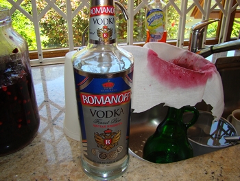 I bottled it tonight into 3 vodka bottles. The cherries and one fifth (750 ml) of 95% grain alcohol made three fifths of liqueur at 31.7% alcohol, probably closer to a flavored vodka than a cordial but tasty nonetheless. The flavor is awesome and I can't wait to try it with a year or two of age on it. We have a Montmorency cherry tree from which the cherries I made it were harvested and we usually get tons of cherries each spring so I'll definetely be making this every spring. ![]() |