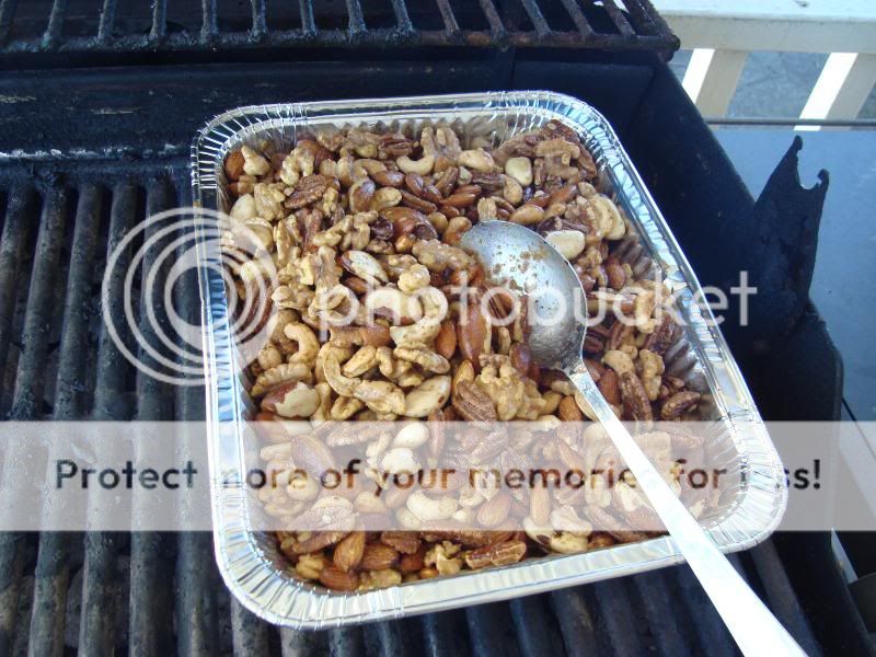 Used my recipe that is posted in this forum, but I thought it would be nice to do a step-by-step. I'm using five different types of nuts this year...Walnuts, Pecans, Cashews, Almonds and Brazil nuts. ![]() Put my butter in a medium saucepan and melted it ![]() Then got my spices and wet ingredients ready ![]() Once the butter was melted, added the spices, hot sauce and worcestershire and whisked like crazy. ![]() Poured the whole mess over the nuts and tossed them by hand until they were all nicely coated. ![]() Then into the smoke for 90 minutes at about 250°...had to use the grill today, the GOSM was giving me fits...could not get it to light. Stirred them about every 15 minutes. ![]() When they were done, brought them inside and spread them on a baking sheet to cool, then vacuum sealed them to be ready for next week. ![]() |