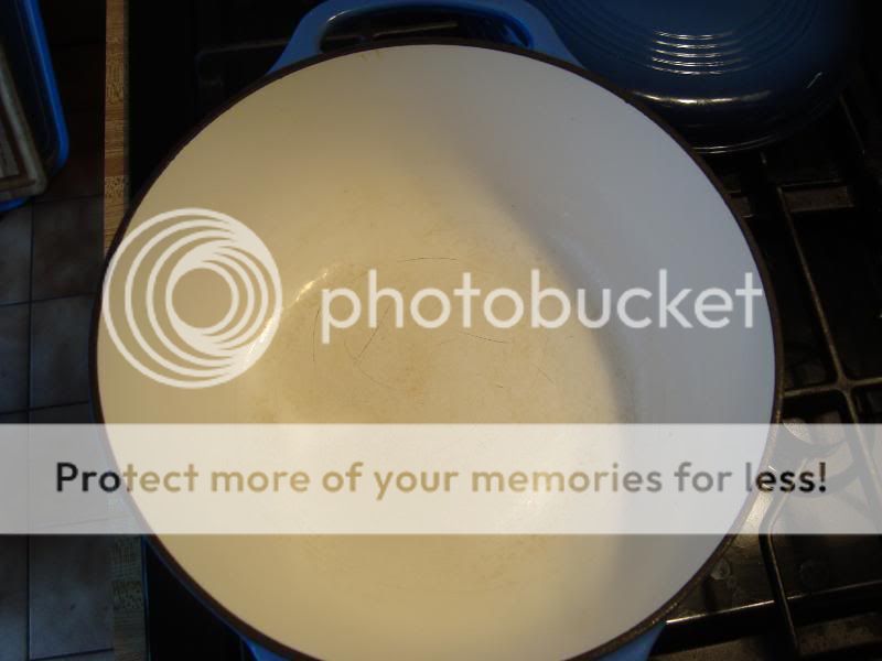 Here you go folks...you may or may not be able to see a couple of small scratches in the enamel due to my "better half" unknowingly using metal utensils when she used the pot. It's still holding up extremely well, and I would not hesitate to buy another $50.00 pot if the need arises. ![]() |