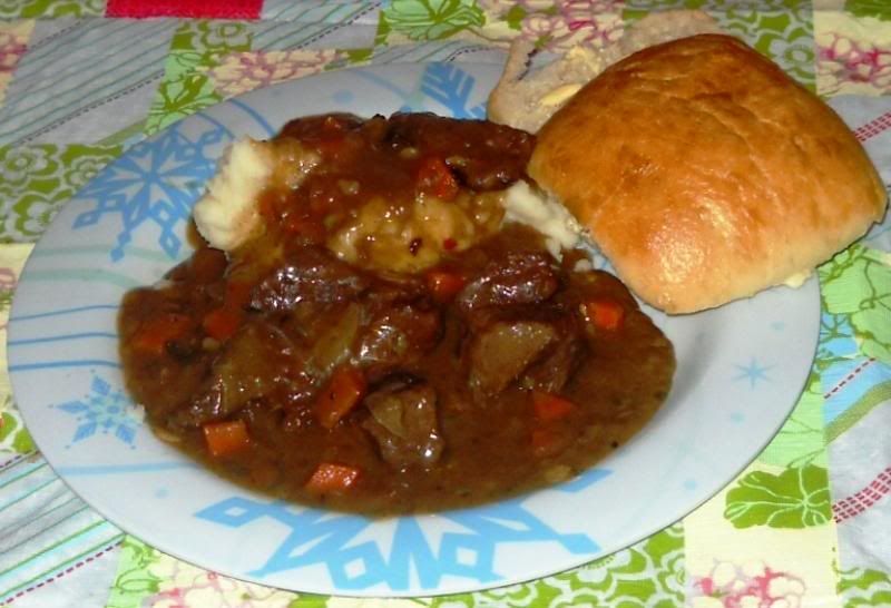 my dad managed to drop by again just in time for supper (funny how that keeps happening!), so he joined us for this meal. results were nearly all positive, with my dad and three of my boys agreeing with me that this was truly a wonderful dish. 1/8 of a teaspoon just didn't seem like enough, so i used just a touch more cinnamon than called for in the recipe, closer to a quarter-teaspoon, and truly enjoyed the essence that it provided. as with the french and belgian carbonade-type stews, this was simple to prepare and made a very rich stew with extremely tender chunks of beef. i was impressed with the mix of flavours that went into this estofado and the way they provided a good balance of savory with a hint of sweet, a breath of spicy and a touch of sour. a very good stew!