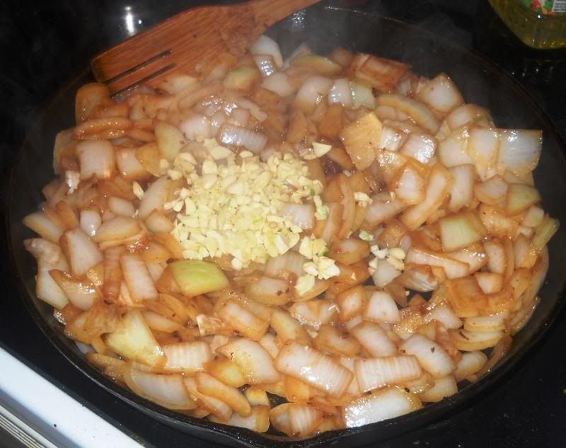 then, i carmelized some onions in a combination of butter and olive oil. when they were just starting to take on that beautiful, brownish-translucent quality, i added some finely-chopped garlic aong with a little more salt and some freshly-cracked black pepper.