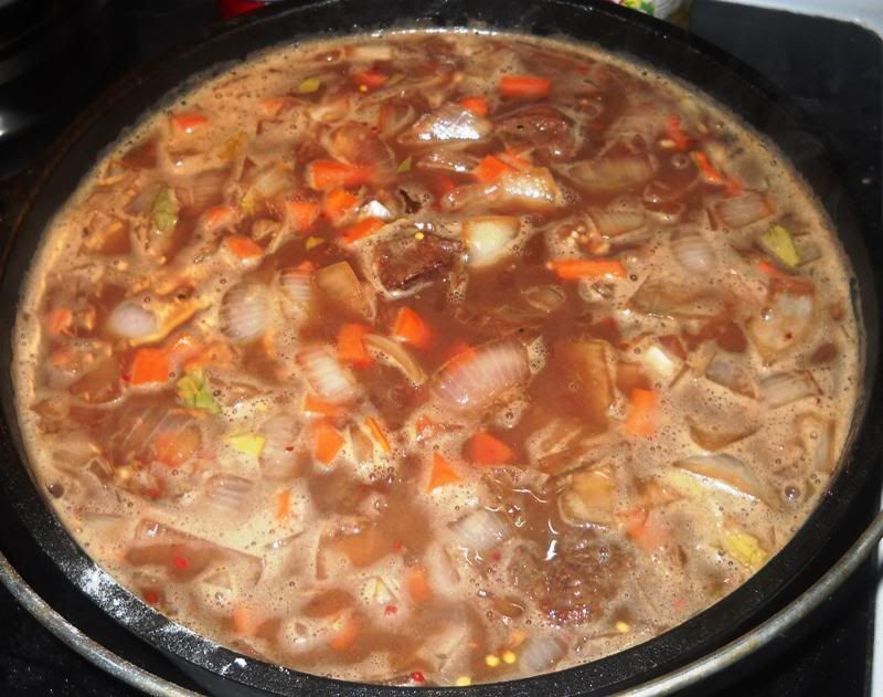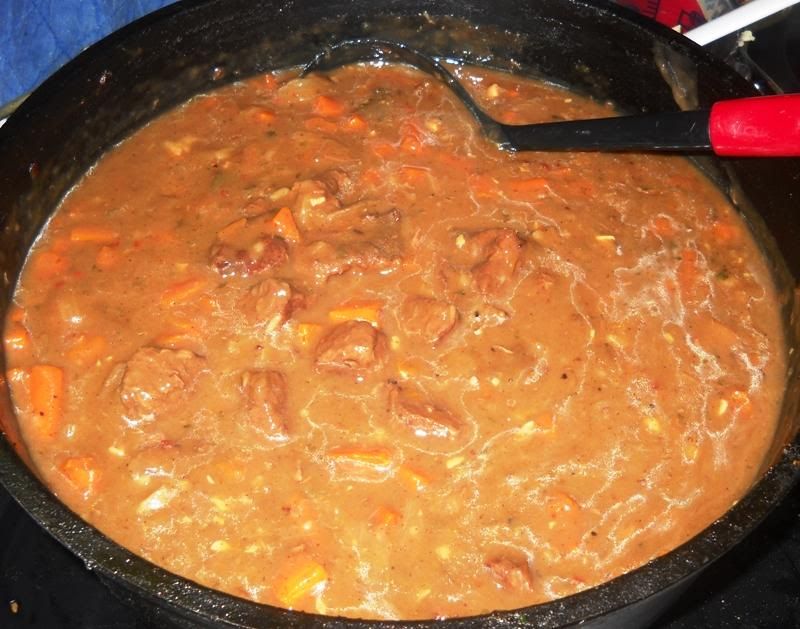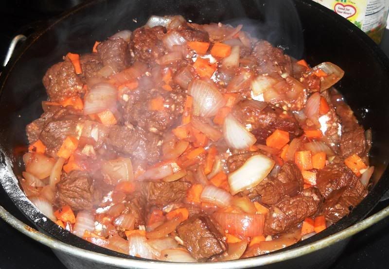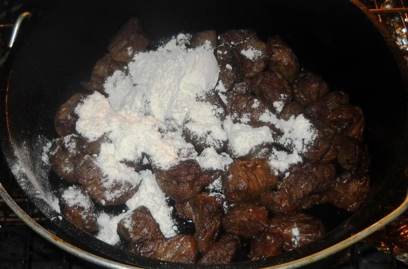 when the beef reached this point, i transferred it to our cast-iron dutch oven, that was staying warm in our oven, and added some flour in order to help thicken the final product.