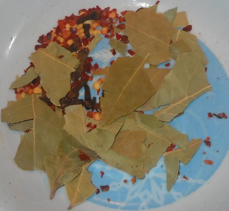 i then added the remaining seasonings and spices, shown here. some folks like to add the bay (laurel) leaves whole, then remove them when the preparation is complete, but i prefer to crumble them up a bit and leave them in the final dish.