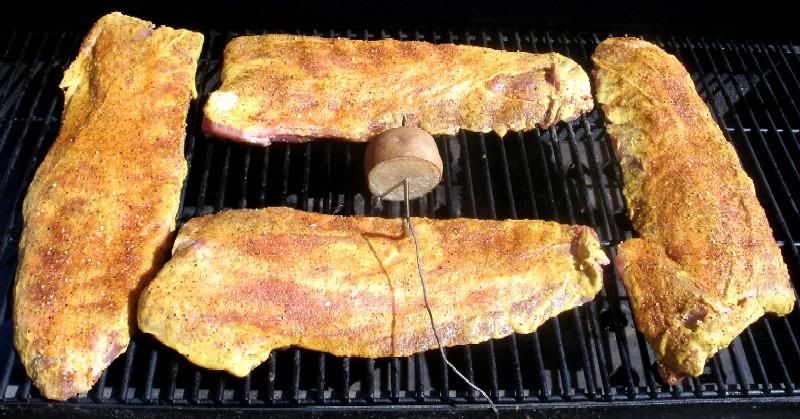 here are the ribs going on the grate in the box pattern described above (yes, i did move the thermometer probe cable after taking the picture!). looking back, i probably could have laid them all side-by-side in a north/south orientation, but see comments above referring to my borth-dakotan heritage. as it was, the rotation worked very well for even and consistent cooking!