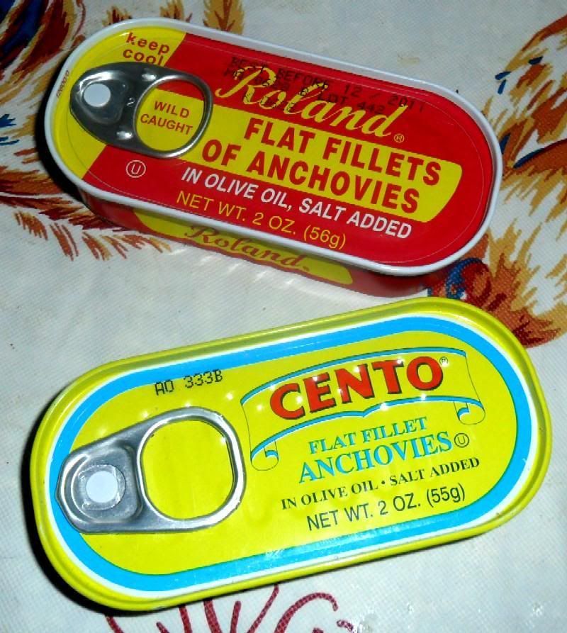 ![]() both tins contain flat fillets of anchovies in olive oil with salt added. the roland brand proudly proclaims that their anchovies are WILD CAUGHT. we shall see if this makes any difference.