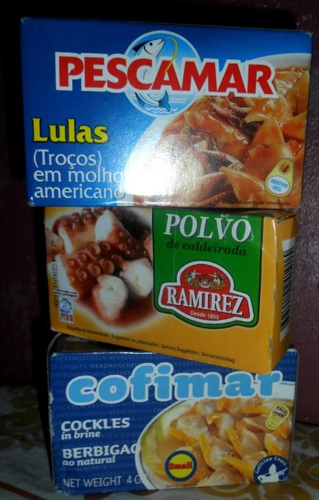 next, we had these gems - imported squids (lulas) from spain, stewed octopus (polvo de caldeirada) from portugal and cockles (berbigao), a product of portugal, evidently caught off the galacian coast: