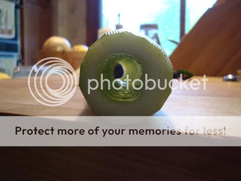 you want to hollow out a cucumber to a point that is past halfway, then flip it around and work inward from the other end, until the two tunnels meet.