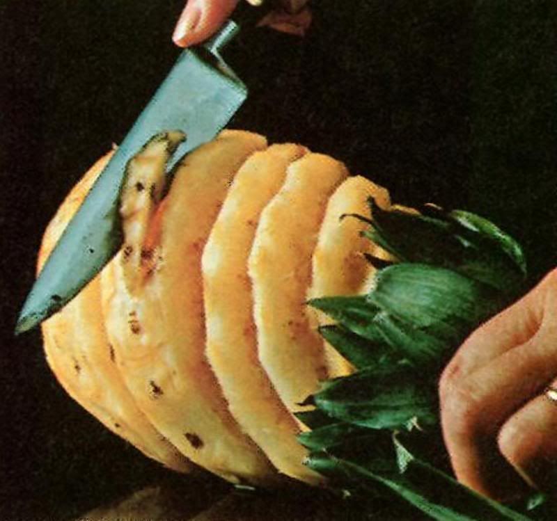 On my menu for the weekend is Rumaki a Hawaiian appetizer (details in post to follow) that calls for chunk pineapple that is skewered. I learned awhile back that the chunk pineapple in cans isn't big enough for this purpose. Again I cheated in the past and opted to buy fresh pineapple that was already peeled and cored in the produce section. Afterwhich I would cut into chunks of the appropiate size.