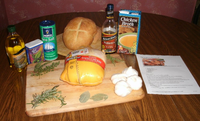 3 sprigs fresh rosemary 40 large cloves garlic, unpeeled 2 bay leaves 6 sprigs fresh thyme Salt and pepper Olive oil Crusty bread Preheat oven to 375 F; put 4 garlic cloves, 3 sprigs thyme, 1 sprig of rosemary and 1 bay leaf in cavity of chicken, then tie the legs together and fold the wings underneath. Heat a good splash of olive oil in a heavy pan and quickly brown whole chicken on all sides; top, bottom etc. Put chicken into a deep casserole with lid and sprinkle the remaining garlic on and around bird. Pour remaining oil from browning over the whole chicken. Toss remaining herbs on and around it, then sprinkle with salt and pepper and put lid on. Seal seam well with tinfoil and scrunch it up tight. Bake for 1 hour and 45 minutes. Do not open oven for any reason; have a beer, watch TV, read a book.