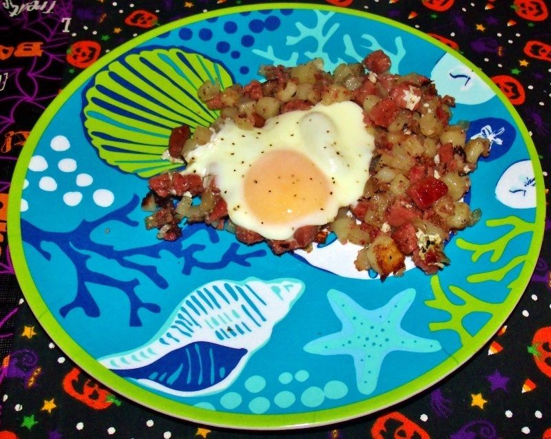 I'll stand by my original dish, although I will very slightly modify the "recipe" that I utilised: To serve 4: 1 can of Spam 1 large onion 4 potatoes Black pepper, to taste 4 eggs Dice Spam, potatoes and onion in a fine and uniform manner; try for a 1/4-inch dice. Heat the Spam and onions in a heavy, appropriately-sized pan over low to medium heat, until the onions just begin to caramelise. Add diced potatoes and cook over medium to medium-high heat, turning and "hashing" occasionally, until the Spam and potatoes are cooked throughout and begin to crisp up. Add pepper to taste, then spread the hash out evenly in the pan. Make 4 depressions in the hash and break your eggs into them, adding just a bit of pepper for seasoning. Leave the pan to sit on medium-low heat until the eggs cook to desired doneness; cover the pan if desired in order to cook the eggs. Divide into 4 equal portions and serve. Ingredients: Spam Onion Potatoes Pepper Eggs This is.....well, this is 5 ingredients......  I learned the first time that I made this that no additional fat or salt is necessary, due to the amount already in the Spam. Such is my entry ~ I do hereby attest that this is, in my opinion, a complete and plausible dish; indeed, the addition of the egg might even be seen as superfluous or "above and beyond....." Nevertheless, there it is.....