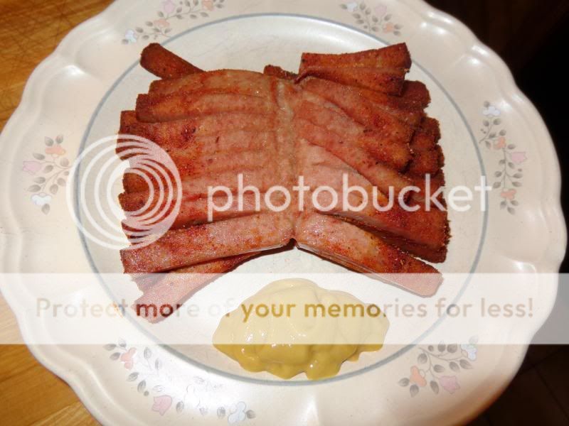 That being said, as you can see I served it up with a bit of honey-mustard hoping I could kill the taste of the Spam with a combination of that and the butt rub.