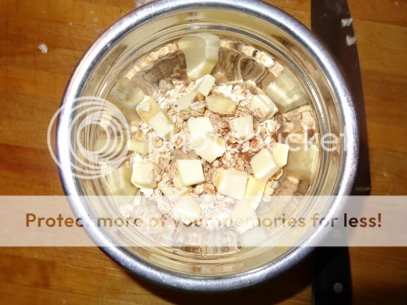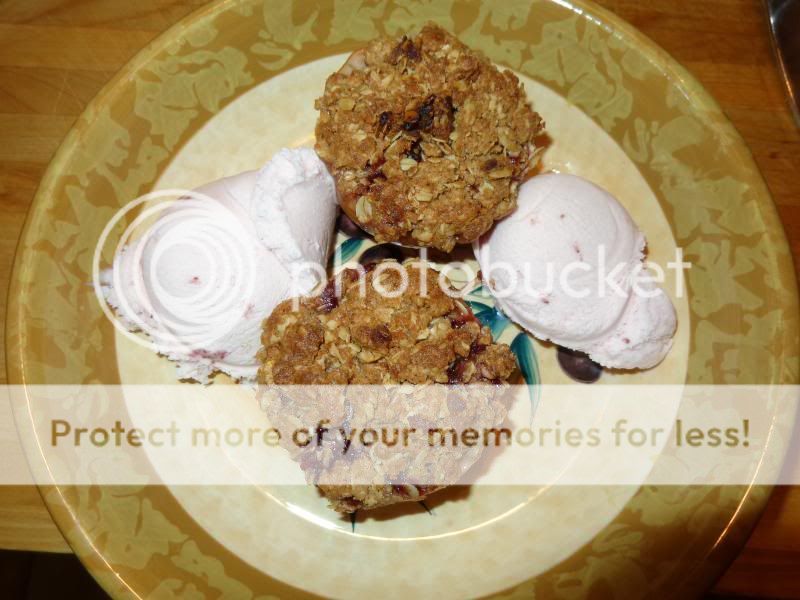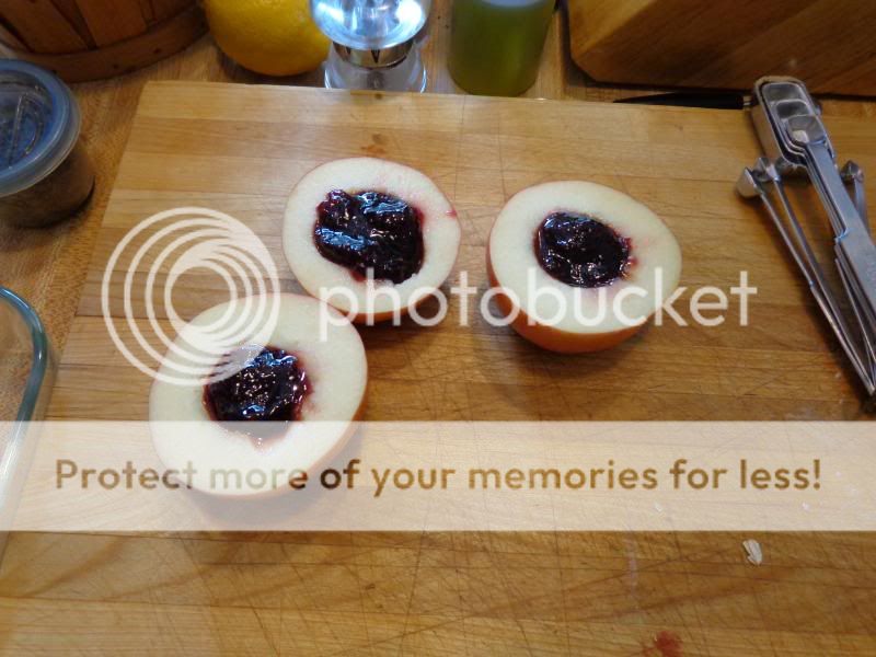 This dish was quite quick and easy to prepare and paired wonderfully with a scoop or two of strawberries and cream iced cream. To start with, all you need are two fugi or gala apples and a lemon. Cut the apples in half along the equator, and then hollow out the core with your melon baller. Dab the apples with lemon juice to keep them from browning, and fill the hollowed out areas with strawberry or raspberry jam. Now place 2 Tbsp flour, 3 Tbsp brown sugar, 1/4 tsp cinnamon, 1/2 cup oats and 3 Tbsp of cold diced butter in a bowl and mix it up with your fingertips as you would with a pastry dough, then press it over the apple halves. Now bake in a 350° oven for 35 -40 minutes (mine took 50) and serve with a scoop or two of your favorite iced cream. |