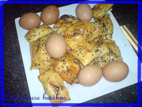Roll out the puff pastry and cut into squares about 5 x 5cm. Brush each square around the edge with egg. Put about a tsp worth of filling in each and fold (for different fillings fold differently). Brush with egg and spinkle with sesame. Place in a preheated oven on 180ºC until they puff up and go golden brown.