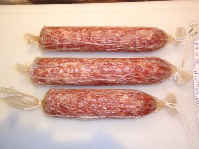 Stuffed and tagged with name of salami, start date, start weight and finish date. I would have used just the red casings but I didn't think I had enough left....wrong!