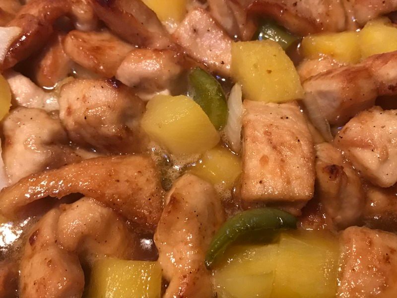 If I'm doing the cut-up chicken breasts then I find an hour is too much and the chicken comes out really dry. So if I'm doing it that way, then I usually just add the pineapple at the beginning and cook it for about half an hour, until the chicken is about 170 degrees internally.