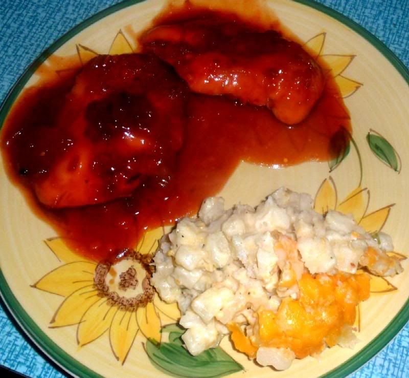 i walked into the kitchen to find the beautiful mrs. tas pulling something out of the oven - not wishing to spoil the moment, i went into the living room and watched TV for a few minutes while she finished her preparations. it wasn't long before she served something i had never seen before - a nice-looking chicken dish with a really delicious-looking and chunky reddish sauce, sitting next to a more-familiar mound of creamy-cheesy casserole made from diced potatoes. i tried the chicken and was immediately hit with a burst of bright fresh flavours - perfect for the emerging spring that we are having up here in north-central montana. it was a little sweet, a little tart, very savory and filled the mouth with surprises from many directions.