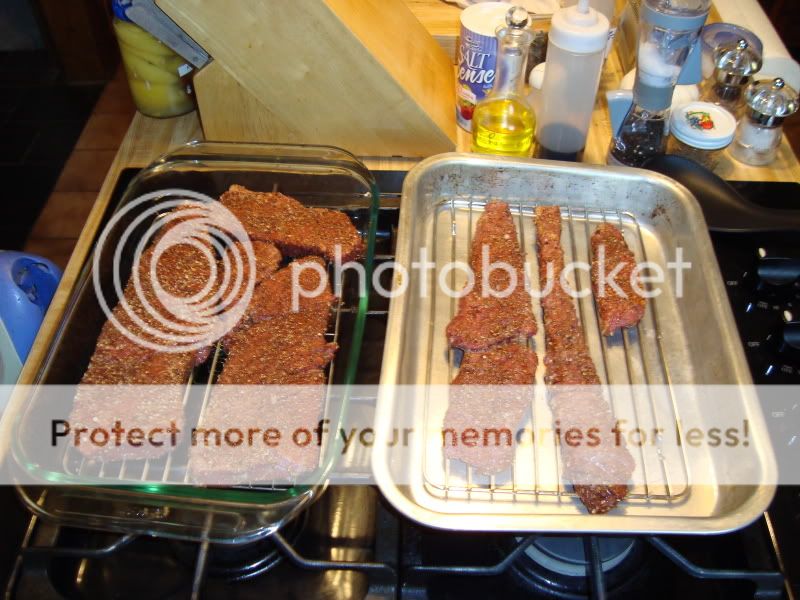![]() Coated the steak well with spices, but instead of the "tilting bowl" method I decided to use some racks....it will be going into the dehydrator soon....check back for updates.