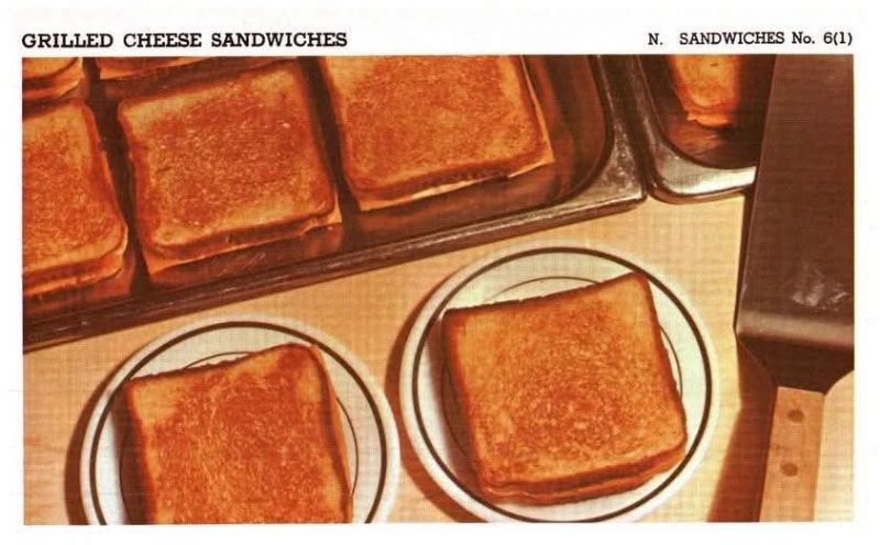 The sandwich was economical, easy to make, met government nutrition standards AND (if done right?) quite tasty. In the 1940s and 50s these sandwiches were open-faced and usually made with prepackaged grated "American" cheddar cheese. It wasn't long before school cafeterias and other institutional kitchens followed suit. The usual accompaniment? Tomato soup. At that time, tomato soup would have been perceived as a healthy dose of Vitamin C. Excess sodium was not an issue.