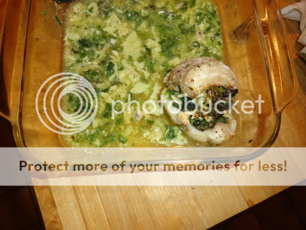The spinach was followed by some gorgonzola cheese, and topped off with slivered almonds...then rolled into pinwheels while I made a basting sauce.